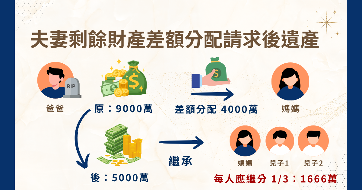 先生的婚後財產 9000 萬、太太的婚後財產 1000 萬,假設都沒有債務,彼此差額就是 9000 萬- 1000 萬=8000 萬,則太太可以跟先生拿 8000 萬的一半也就是 4000 萬,這樣就可以讓兩人的婚後剩餘財產就都變成 5000 萬。